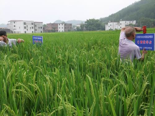 近日,上犹县农粮局组织种子、植保、农技等有关业务站,深入该县中稻新品种展示核心区社溪镇黄塘村,开展穗期田间管理工作,重点加强病虫害防治,尤其是蜒虫、稻瘟病,以确保展示工作取得成效。同时,对展示核心区及小区对比试验点的展示牌、指示牌、品种牌已全部竖立到位,以取到更好的宣传效果。