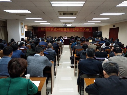 10月30日上午,市农粮局召开全体干部职工大会,传达贯彻党的十九大精神及全省、全市领导干部会议精神,布置贯彻落实工作。局领导,局机关各科室、局属各单位全体干部职工及下属单位负责同志参加会议。局长、党组书记吴至海同志作精神传达并作重要讲话,局总农艺师、党组成员周昱主持会议。
